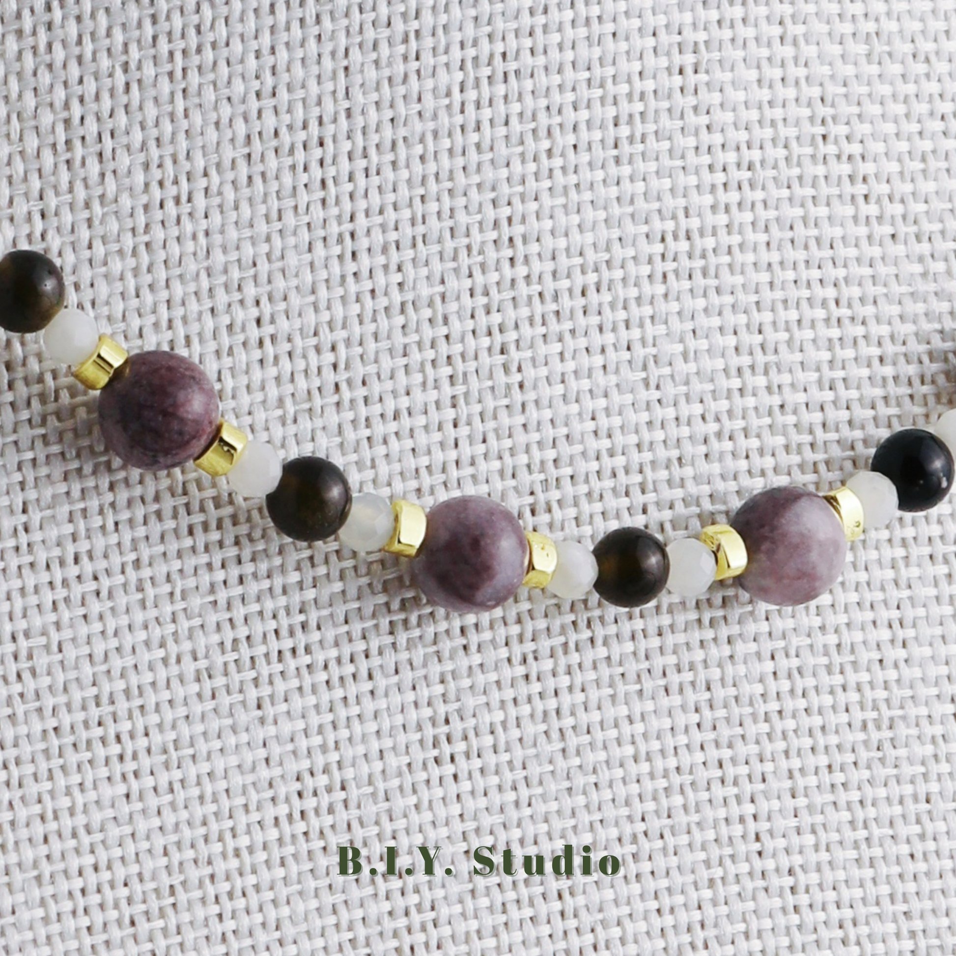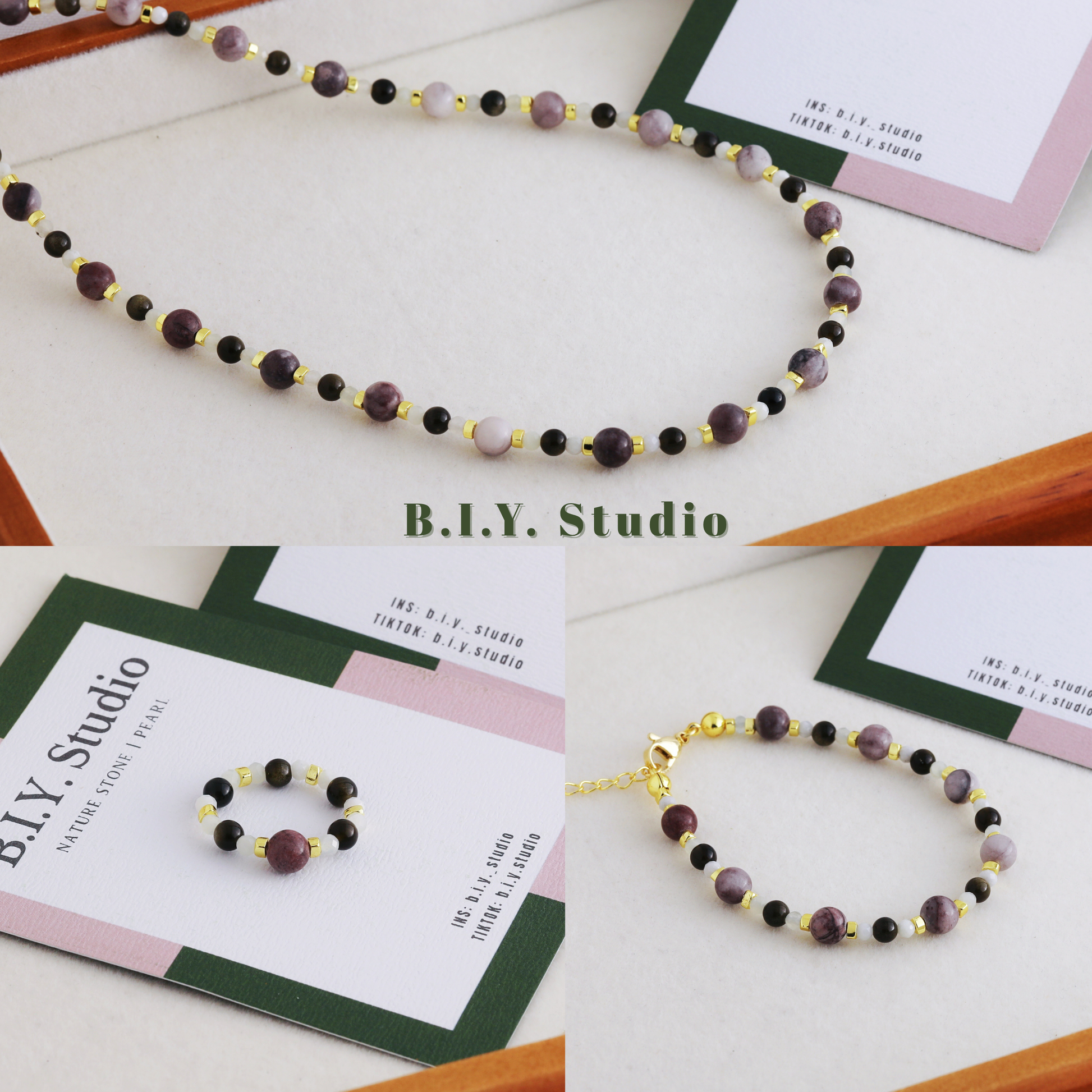 On a clear night, the moon rises in the sky, casting a soft, silvery glow over the world. The Lunar Haze series captures the tranquility and romance of the moon with a combination of amethyst, gold obsidian, and Xinshan jade. Amethyst, with its deep, purple color, is like the night sky, evoking a sense of mystery and calm. Gold obsidian, with its glittering flecks of gold, is like the stars twinkling in the moonlight, adding a touch of magic. Xinshan jade, with its smooth, creamy texture, is like the misty haze that surrounds the moon, creating a sense of softness and serenity.