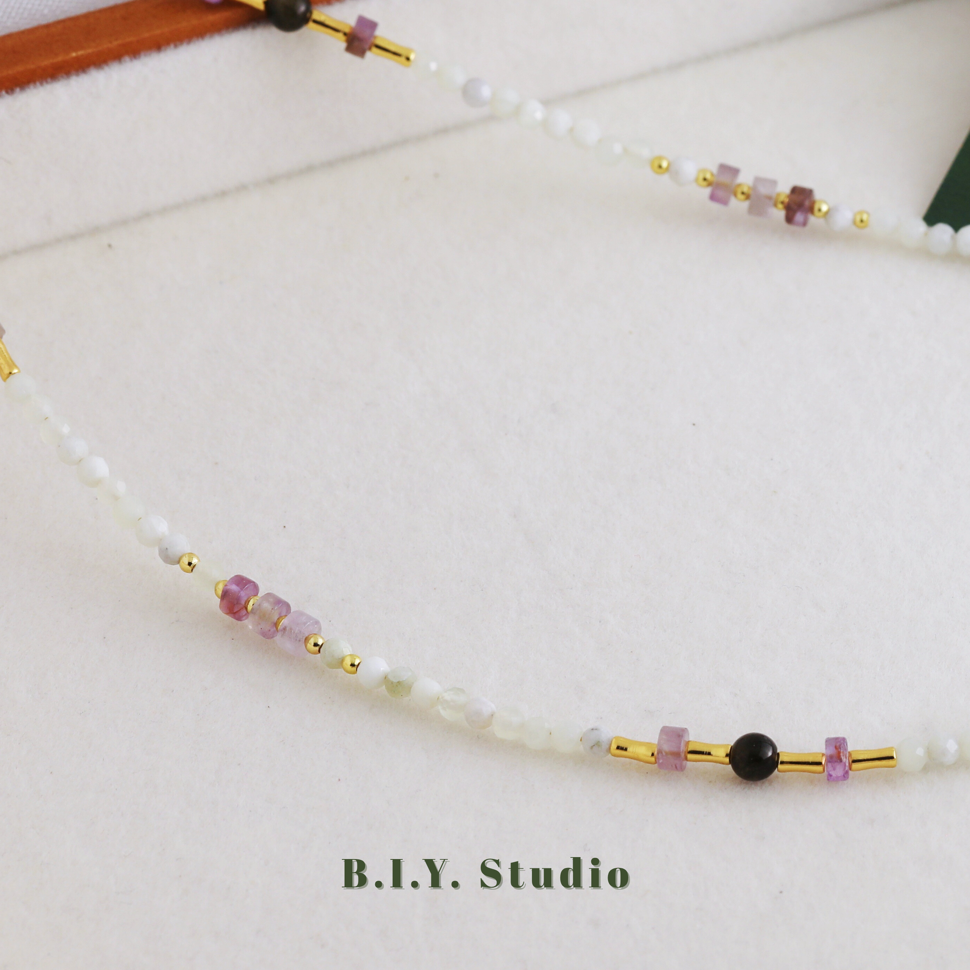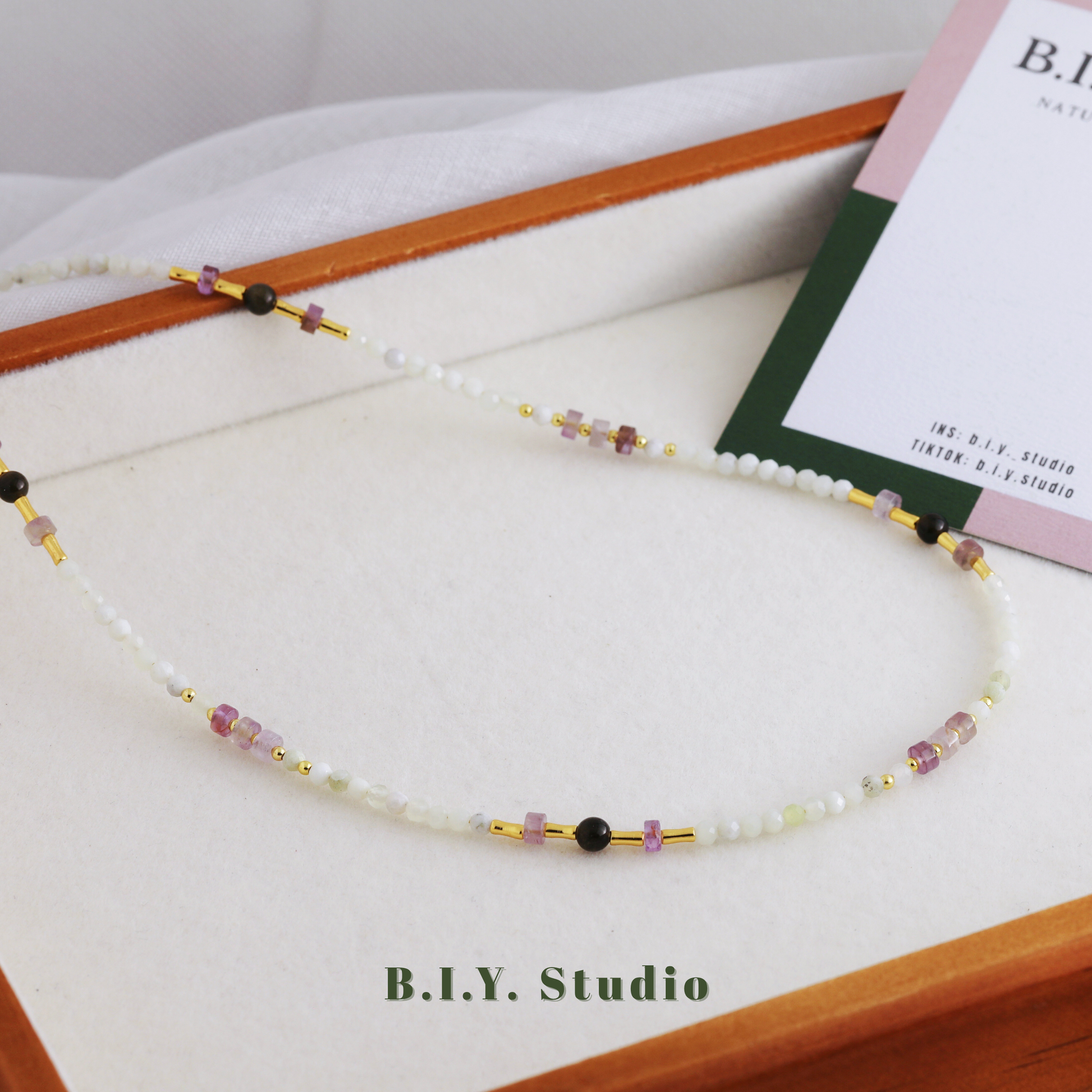 On a clear night, the moon rises in the sky, casting a soft, silvery glow over the world. The Lunar Haze series captures the tranquility and romance of the moon with a combination of amethyst, gold obsidian, and Xinshan jade. Amethyst, with its deep, purple color, is like the night sky, evoking a sense of mystery and calm. Gold obsidian, with its glittering flecks of gold, is like the stars twinkling in the moonlight, adding a touch of magic. Xinshan jade, with its smooth, creamy texture, is like the misty haze that surrounds the moon, creating a sense of softness and serenity.