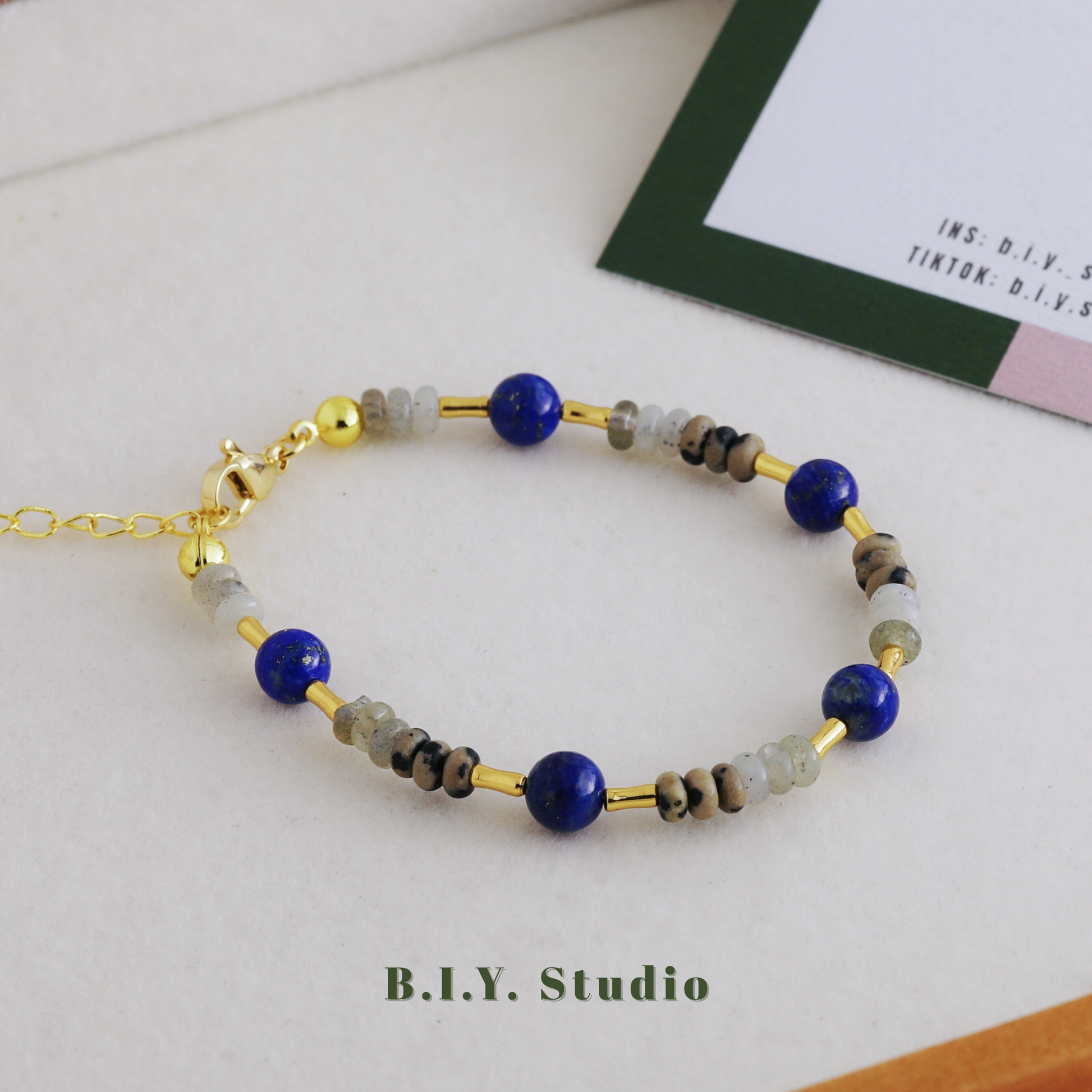 Materials: Lapis Lazuli, White Flash Stone, Dalmatian Stone, 18K Gold-plated Accessories