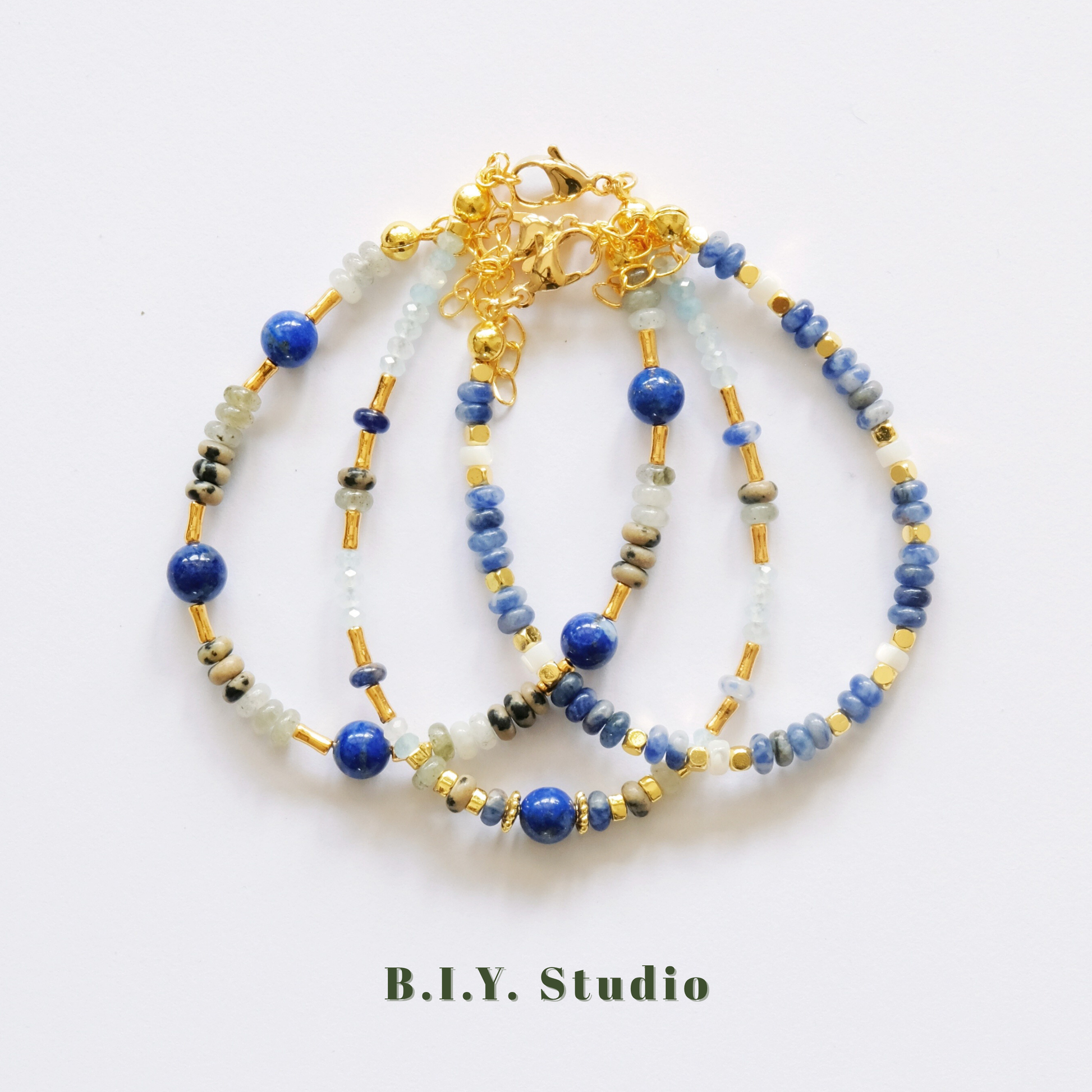Materials: Aquamarine, Larimar, Dalmatian Stone, 18K Gold-plated Accessories