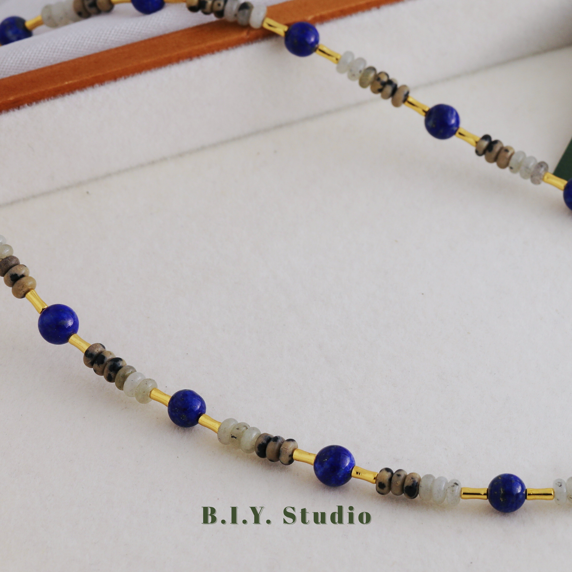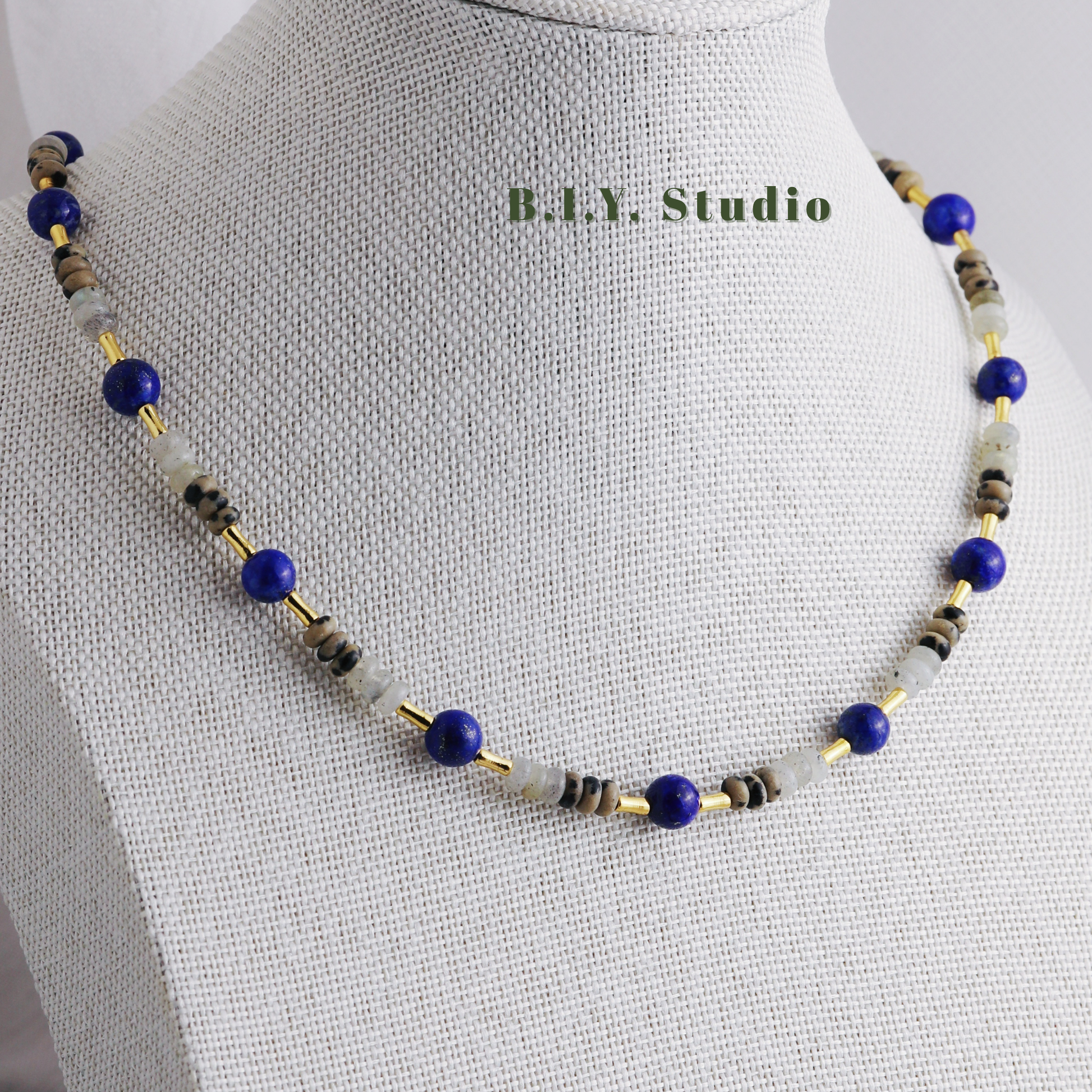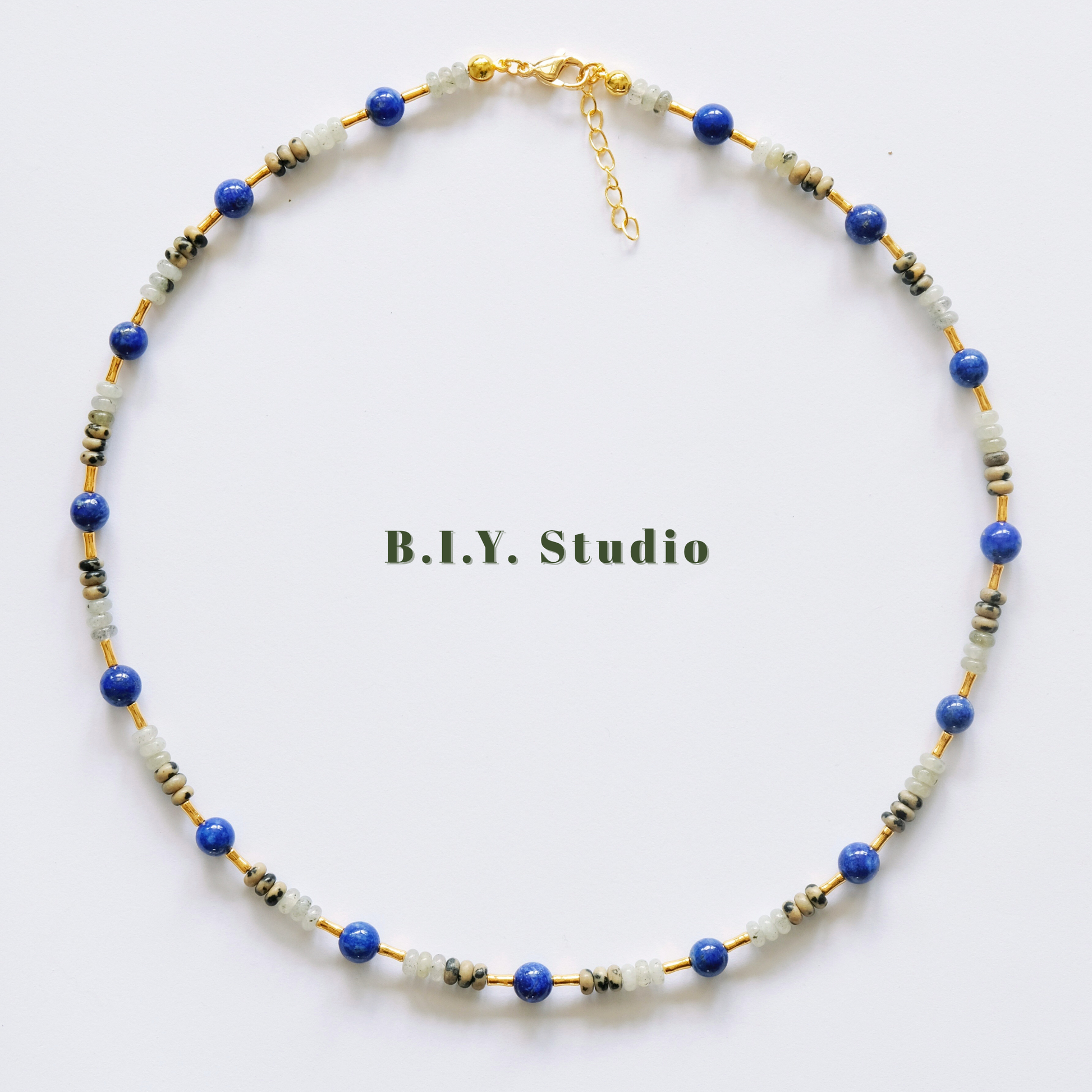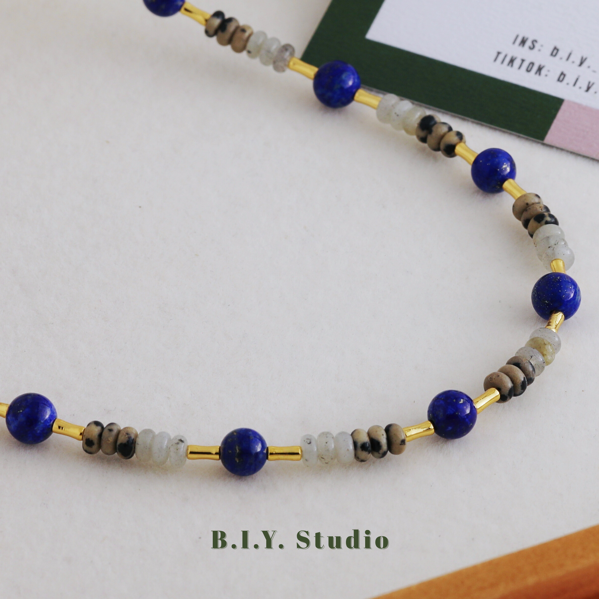 Materials: Lapis Lazuli, White Flash Stone, Dalmatian Stone, 18K Gold-plated Accessories
